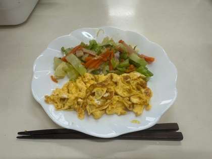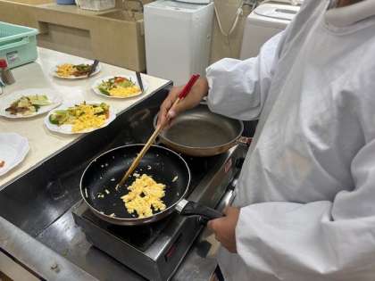 家庭科の学習で「ハム入り野菜いため」と「スクランブルエッグ」を作りました。