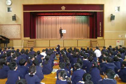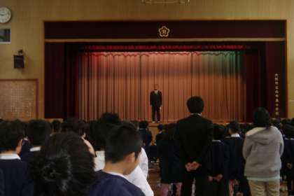 次に、生活指導担当の先生から冬休みを楽しく過ごすための毎日の生活について、「きたなかじま」をキーワードにしたお話を聞きました。最後に校歌を元気よく、きれいな声で歌い終業式を締めくくりました。