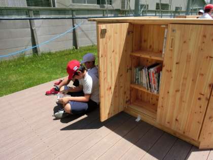 22日(火)に北中島ライブラリーパークが開館しました。これは児童が読書に親しむために、中庭にウッドデッキを作って本棚を設置し、読書スペースを作ったものです。今日は6年生がライブラリーパークで読書をしました。芝生の上やベンチに座り、思い思いに読書を楽しんでいました。また、区役所からも視察に来られ、挨拶をしていただきました。