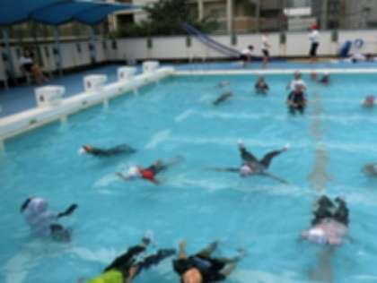 子どもたちは、服を着たままプールに入り、水の中で自由に歩いたり泳いだりしました。服を着たままで水に入ると、とても重たく、いつものようにはできないことに気づきました。
