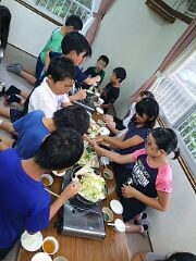 夕食はすき焼きでした。まず、食事係がしっかりと準備をし、いただきますのあいさつの後で、各活動班で手際よくすき焼きの味付けをしました。おいしくできたのでしょう、ほとんどの班が完食していました。