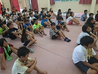 お風呂が終わったのが午後5時過ぎ。夕食までに1時間以上もあったので、サプライズ?で全員ホールに集まり、雨天時のために準備してあった「先生ばかりが住むマンション」というゲームをしました。カードに書いてある文章を活動班の一人ずつ読み上げ、住んでいる部屋を考えるゲームでした。班のメンバーで協力して推理をしました。