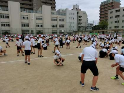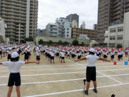 9月13日(木)に体操集会を行いました。運動会の開会式の隊形で並び、係の児童を中心にラジオ体操の練習をしました。その後、2週間後に控えた運動会のために、全校児童で運動場の石拾いをしました。合計1万個を目標に、みんな一生懸命に拾っていました。バケツにはみんなが拾った石がこんなにたくさん集まりました。