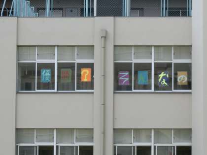 今年のスローガンは「優勝? そんなのカンケ—ねえ 楽しめ!」です。少し懐かしい感じがしますね。西校舎の窓に掲示して、運動会を盛り上げます。