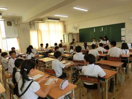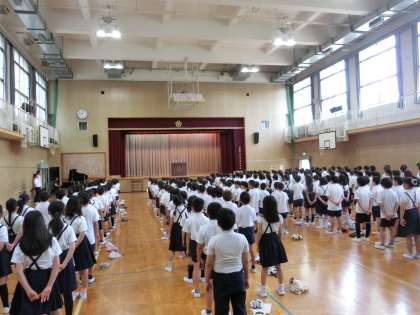 1時間目に講堂で始業式を行いました。校長先生と生活指導の先生の話を聞き、みんなで校歌を歌いました。各学級では、宿題を提出したり、夏の思い出を発表したりして過ごしました。