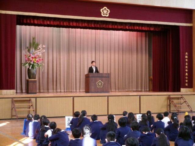 始業式では、校長先生から大切にしたい3つのこと、「自分も友だちも大切にしよう」「あいさつをしっかりしよう」「感謝の気持ちを忘れずにいよう」のお話がありました。子どもたちは真剣な表情で聞いていました。