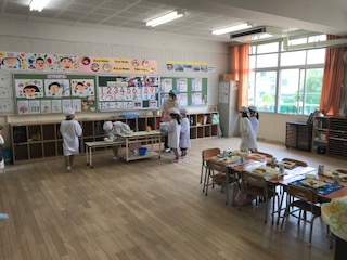 給食がスタートして約3週間。自分たちで準備や片付けをするのも慣れてきましたが、今日は給食参観ということもあり、ちょっと緊張した様子で準備をしていました。