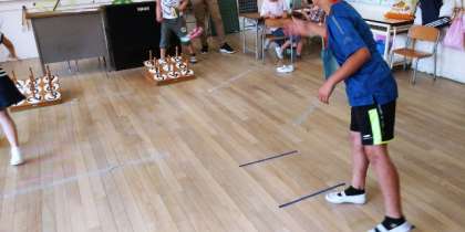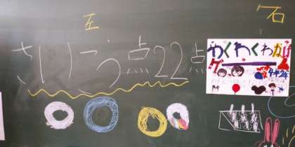 2年生は「わくわく、わなげゲーム」です。新聞紙とビニルテープで作った「輪」を投げます。高得点目指して「レッツ・トライ!」