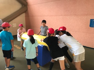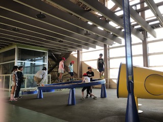 職員の方に但馬ドーム内の説明をしていただき、室内遊具で遊びました。