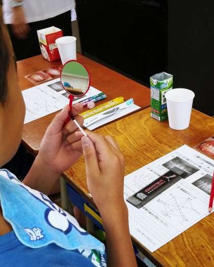 唾液の働き、よくかんで食べることの大切さを習ったあと、鏡をもって自分の歯ぐきの腫れているところをチェックしました。試薬を塗って自分の歯磨きの磨き残しているところがわかり、後で丁寧に歯磨きをしました。