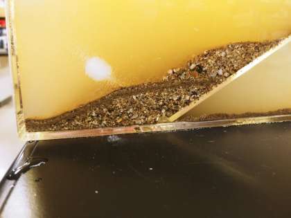 流れる水のはたらきによって運ばれた土が堆積して地層ができることを実験して確かめました。水の中で地層ができることに子どもたちも驚いていました。