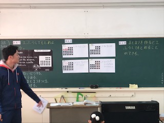 はみ出している分を移動させる、わけて考える、3のまとまりが全部でいくつか考える、全部埋めてからあとで引いて考えるなど、それぞれが工夫した数え方を発表することができました。