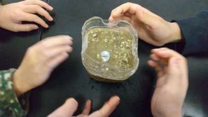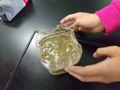 水を混ぜた砂をペットボトルに入れ、その上に家に見立てたおもりをおきます。地震の振動の代わりに指でペットボトルをたたくと、水が噴出し、おもりも沈んで液状化現象が再現されます。だんだんおもりが沈んでいくのを見て「液状化現象がこわい」ことを学ぶことができました。