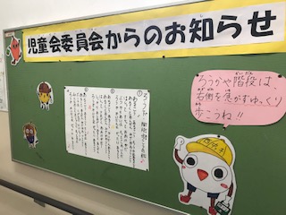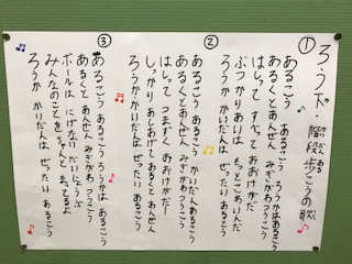 先月、「さんぽ」の曲にあわせた、廊下・階段を正しく歩こうという歌詞を作成しました。6年生全員が合唱したその曲を毎朝、放送委員が流し、皆で意識しようと進めています。