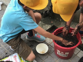 バケツに土をたっぷり詰め込み、水を加えて泥状にした中に埋め込みました。