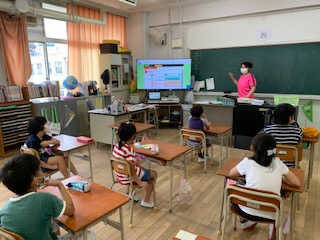 今年は、まずは聴く学習に重点を置き、デジタル教材「DREAM」を使って、歌や会話、フォニックスから正しい発音を聞きとっています。ときには、小さな声で発音をしてみたり、先生からの質問に答えたりしながら楽しく学習ができました。