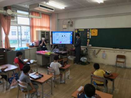 1年生は、初めてタブレットを使うため、電源を入れる、ログインをする、ソフトを立ち上げる、ことを順に説明を聞きながら、タッチパネルに指で操作していくことができました。