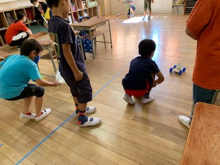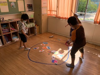 10月1日(木)の2・3時間目は楽しみにしていたおもちゃランドでした。2年生が準備したあそびのコーナーを1年生がまわっていきます。パッチンガエル、ロケットポン、ヨットカー、コロコロコロン、魚釣りというたくさんのコーナーが用意されました。