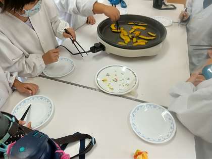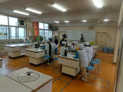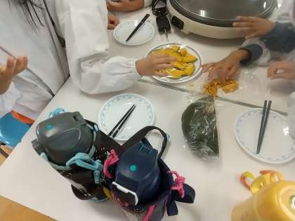 10月14日(水)の5時間目に、1、2年生はカボチャパーティーをしました。学校で種から育てたカボチャを9月に収穫し、今日そのカボチャを電子レンジとホットプレートで調理して食べました。