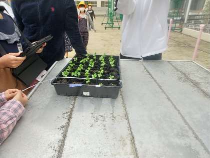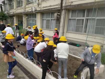11月13日(金)の2時間目後の15分休憩に、なにわの伝統野菜「田辺大根」の苗を学習園に植え替えました。11月4日に種まきをしたものが、順調に発芽し、植え替えできるまでに成長しました。上級生が下級生に植え替え方をやさしく教えている場面もありました。しっかりと根付くように願うばかりです。