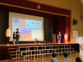5年生は英語の学習で学んだ「Where do you want to go?」の表現を使って、自分達の行ってみたい国の有名な食べ物や観光地を調べてプレゼンテーションにまとめ、英語を交えて発表しました。