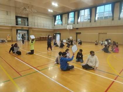 講堂の舞台の幕間に「もの」を投げて、たてわり班のみんなでそのものが何か、当てるというゲームでした。