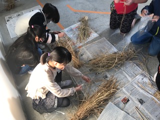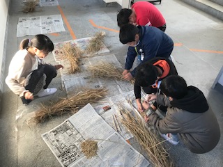 23日(水)、5年生がバケツ稲で育て干していた稲の脱穀作業に挑戦しました。