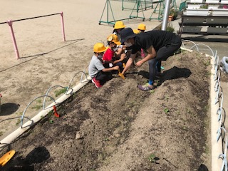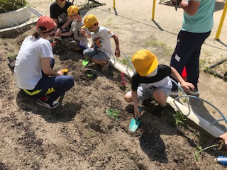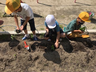 9日、生活科で取り組んでいる「やさいづくり」について、いよいよ苗を学習園に移し替えました。5月19日に種をまいてから20日ほど経ち、4種類(トマト、きゅうり、かぼちゃ、オクラ)の野菜は順調に本葉をつけるまでに成長しました。