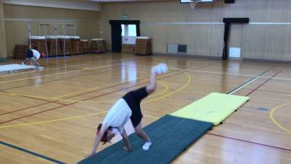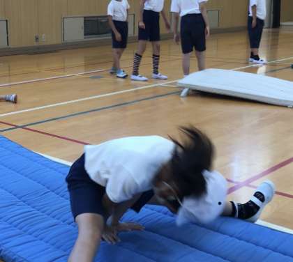 足を開くタイミングや手で押し込むタイミング、手をつく位置など思考錯誤し、仲間と見合いをしてステップアップしています。