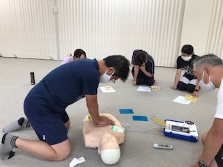 一連の救助の基本を確認した後、一人一人が正しい方法を身に付けられるよう胸骨圧迫やAEDの操作を行いました。