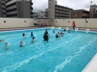 他学年より、随分水位を下げているので、怖さもなくは入れたようです。少しずつ水に慣れながら、もぐったり、浮いたりできるようにと考えています。