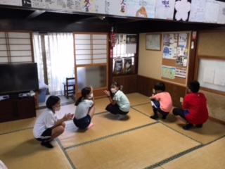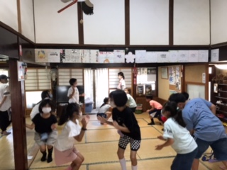 次の魚つかみまでの間、大広間で今夜のキャンプファイヤのスタンツ練習をしています。