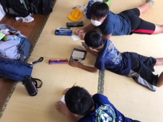 部屋に戻って、はがきに今日の思い出を書いていく班と、お風呂に入る班とに分かれて、順に進めています。