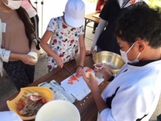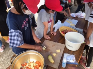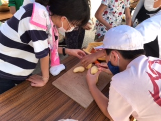 友達のやり方も参考に、上手に包丁やピーラーを扱って調理を進めています。