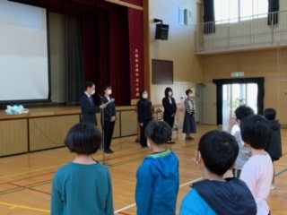 始業式では、はじめに転出入した教職員の紹介があり、次に校長先生から今年一年の目標のお話がありました。西中島小学校では、互いに思いやりを持ち、自ら挑戦する子をはぐくむ「元気・根気・本気の西中島小」を目標として、みんなでよい学校にしていこうというお話がありました。