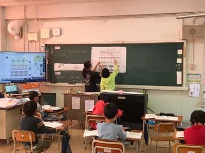 今日は、円でかかれた模様について、コンパスを使って同じ模様をかけるように、「どこを中心にかかれた円なのか」を考える学習でした。