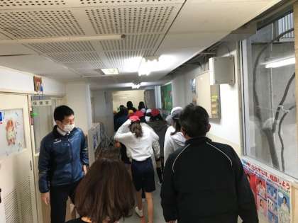 17日(火)、避難訓練を行いました。今日の訓練は、地震を想定したものです。まず、1次避難として揺れが収まるまで机の下で身をかがめ、運動場に避難しました。次に、津波に備えた2次避難として、4階の音楽室前まで避難を行いました。(写真は2次避難の様子です)