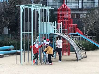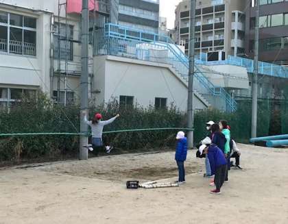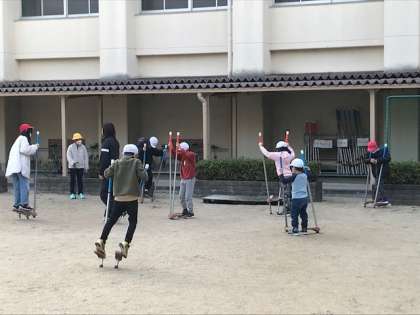 かけっこあそび、ボールけりあそび、竹馬あそび、ボールなげあそび、幅跳びあそび、一輪車あそびに分かれて取り組みました。