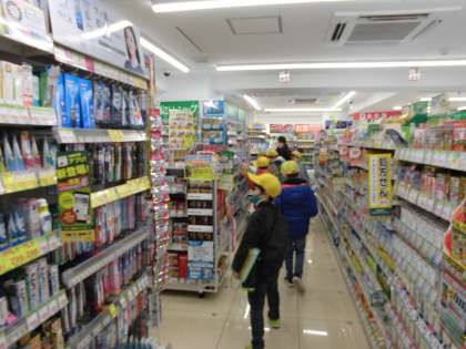 三つ目に、スギ薬局さんへ行きました。1日のお客さんの数や、コロナ流行により困ったことなどの話を聞くことができました。売り場見学では、家にあるのどあめやティッシュ、化粧品や飲み物を発見し、うれしい声があがっていました。