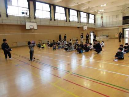 その後の始業式では、校長先生のお話、担任など担当教職員の発表、児童代表による「誓いの言葉」、生活指導担当の先生のお話などがありました。最後にはみんなで校歌を歌いました。