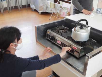 学校のコンロは、押して回すタイプ。なかなかうまくつかず、何度もチャレンジした人も!