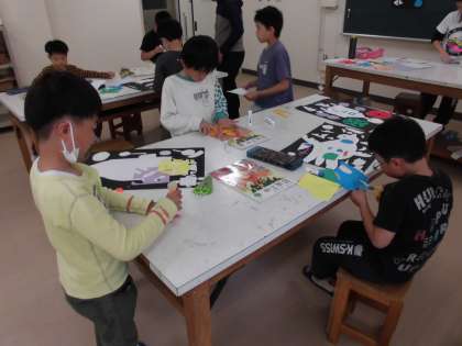 自分の思い描く世界を、画用紙や折り紙をはさみで切り、貼り付けて表現しました。