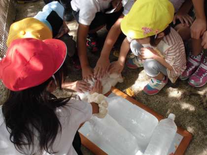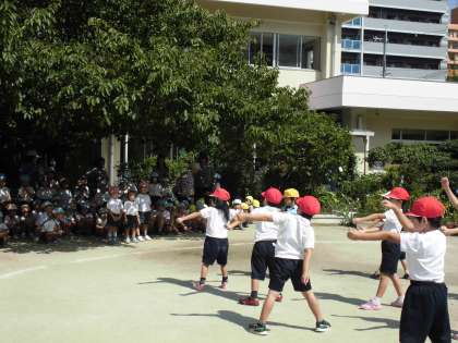 9月15日、西中島幼稚園さんと1年生の交流会がありました。「動物となかよくなろう」という学習で、幼稚園のうさぎやカメなどとふれあい活動をさせてもらいました。その後、運動会の練習中のダンスを披露しました。幼稚園のみなさん、ありがとうございました。
