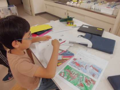 「海」「高層ビル」「恐竜」等自由なテーマを選びます。インターネットで画像を検索し参考にしました。