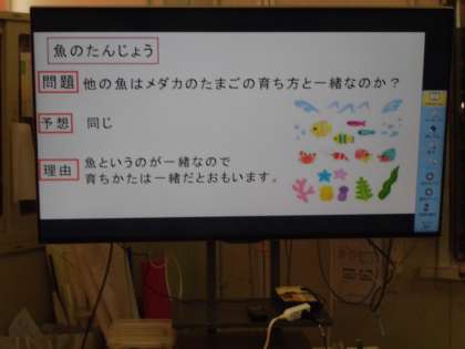 発表内容として、台風のことや魚のこと、生物の誕生の違いなど、自ら調べた内容や写真を見つけ、貼り付けたりまとめたりして発表しました。内容もしっかりとしたもので、初めて知ること、納得しあう内容と多く出ていました。