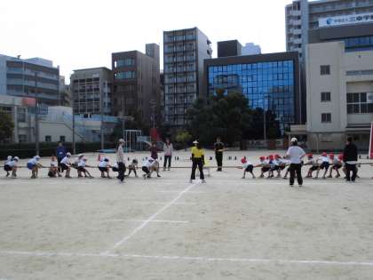 高学年は流れを思い出しながら、低学年は長く大きな綱に初めて触れる様子で、ルールを守りながら一斉に綱を引いてみました。力いっぱい綱を引きながら、一通りの流れを覚えていきました。