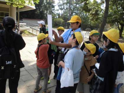 秋晴れの中、たてわり班で、オリエンテーリングを行いました。