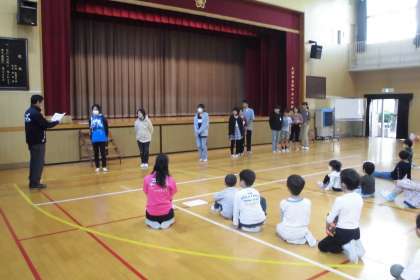 ゲームの後は、先週あった全校遠足のオリエンテーリングの表彰式をしました。表彰とともに、6年生に感謝状を渡しました。