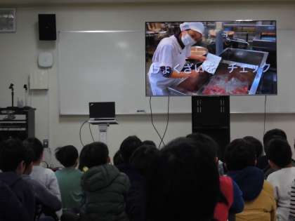 いつも食べている給食のパンやご飯、牛乳などはどこから運ばれてくるものか、また普段入れない給食室の中を、教頭先生が撮影してくれた調理のシーンなどを観ることができました。児童だけではなく、教職員も知らなかったことを知ることができました。