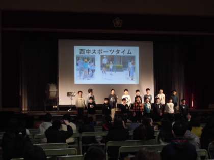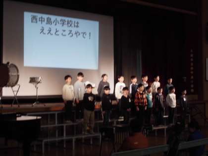 中学年の元気いっぱいの声で、西中島小の学校での様子、西中島小のいいところ紹介や、茶色の小びんの演奏に合わせて、西中島小に関する替え歌を披露してくれました。